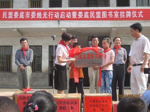 邵瑛宣布“民盟婁底市委燭光行動正式啟動”后,將“婁底民盟圖書室”匾牌授予惠民學(xué)校校長,將凝聚著婁底民盟、婁底孔子學(xué)堂和婁底二小師生愛心的1300多本圖書送到了學(xué)生手中。在邵瑛的親自指導(dǎo)下,婁底二小與惠民學(xué)校也于當(dāng)日正式結(jié)成幫扶對子。