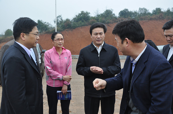 3月29日,市人大常委會主任易春陽(右2),市政協副主席、民盟市委主委邵瑛(左2)一行到萬寶新區調研城建工作。