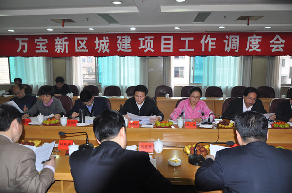 3月29日,市人大常委會主任易春陽(右3),市政協副主席、民盟市委主委邵瑛(右2)等領導,主持召開萬寶新區城建項目工作調度會。