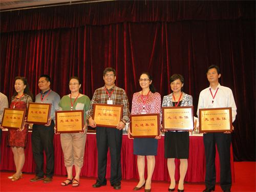 2013年10月10日,邵瑛(右3)上臺領(lǐng)取民盟中央組織發(fā)展工作先進集體獎。歐貽宏攝影。