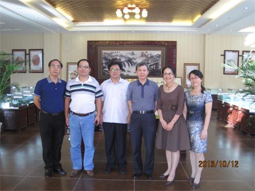 2013年10月12日,陳幼平(右3),在趙為濟(左1)邵瑛(右2)、徐智(右1)、翟見宇(左3)等陪同下,到盟員企業(yè)家陳春節(jié)(左2)創(chuàng)辦的雨花石展覽館參觀并合影。