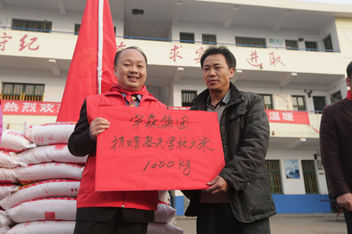 潘杰(左)代表宇森汽貿集團向惠民學校捐贈大米1000公斤