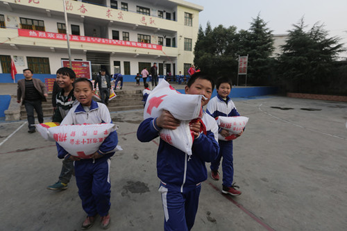 婁底市政協副主席、民盟婁底市委主委邵瑛等一行一走進學校,孩子們就親熱地上前迎接他們的邵阿姨。大家興高采烈地將由宇森汽貿、婁底市紅十字會捐贈的1000公斤大米搬進學校食堂儲藏間。