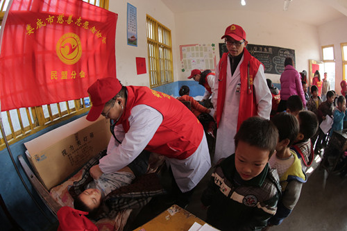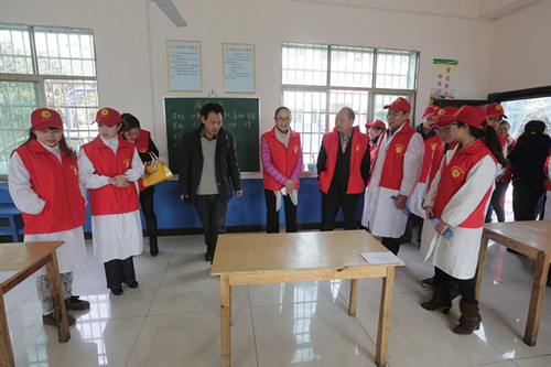 捐贈儀式結束后,婁底市中心醫院大內科主任、民盟婁底市中心醫院支部主委李文華,率民盟支部部分盟員醫務人員給學校全體學生做體檢。