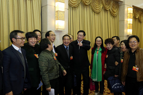 杜家毫省長(右5)出席省政協(xié)委員聯(lián)組討論時(shí)與民盟界別委員親切交流。
