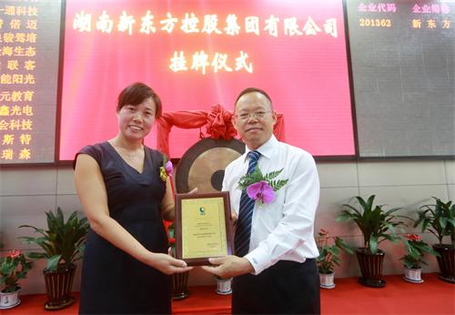 8月13日,上海股權(quán)托管交易中心副總經(jīng)理郭洪俊向掛牌的湖南新東方集團(tuán)董事長李佳頒發(fā)企業(yè)紀(jì)念牌。
