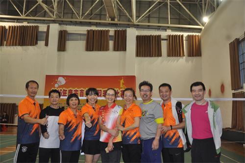 邵瑛(中)與民盟羽毛球隊的隊員們合影