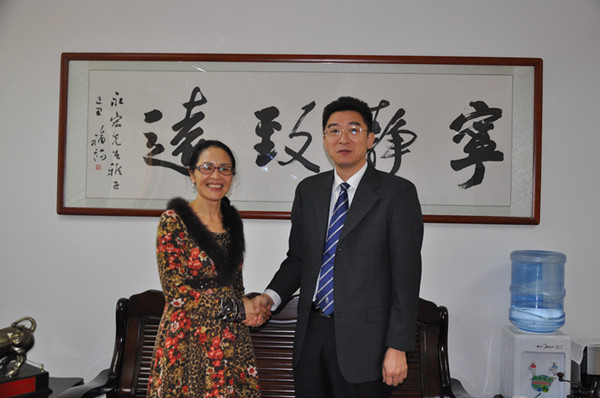 惠州學院院長彭永宏(右)在院長辦公室親切會見婁底市政協邵瑛副主席(左)