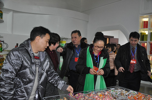 邵瑛(中)等在產(chǎn)品展示廳品嘗鴻冠集團生產(chǎn)的餅干