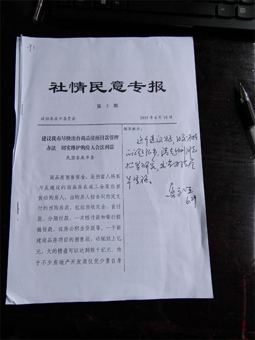 2015年6月18日,婁底市政協第5期社情民意專報刊登了民盟婁底市委關于《建議我市盡快出臺商品房預付款管理辦法 切實維護購房人合法利益》社情民意信息,得到了中共婁底市委書記龔武生高度重視并批辦。